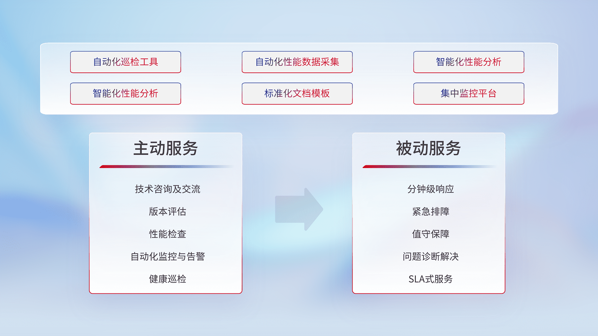 智能化工具和标准化文档,,保障服务质量,,提供主动服务(包含技术咨询、、版本评估、、性能检查、、自动化监控与告警、、健康巡检)和被动服务包含(分钟级响应、、、紧急排障、、、、值守保障、、、、问题诊断解决、、、、SLA服务)。。。。