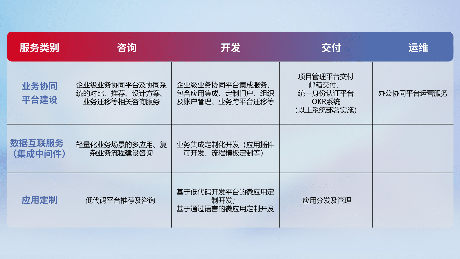 针对钉钉、、企微、、、IDaas等平台级产品提供产品的规划、、、方案、、交付、、定制化开发等服务,,,实现如统一协同办公、、、智能客户服务、、、、混合会议管理、、、智能数据查询、、、等业务场景,,,,实现数字化转型。。。。
